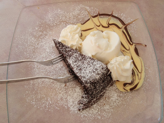 Torta de amêndoas, cacau, chocolate amargo e gelato de amêndoas e panna montata